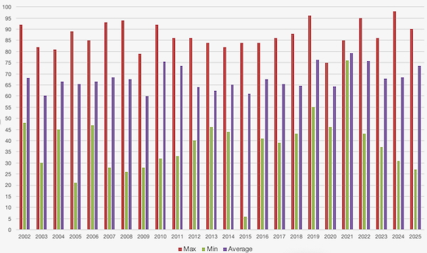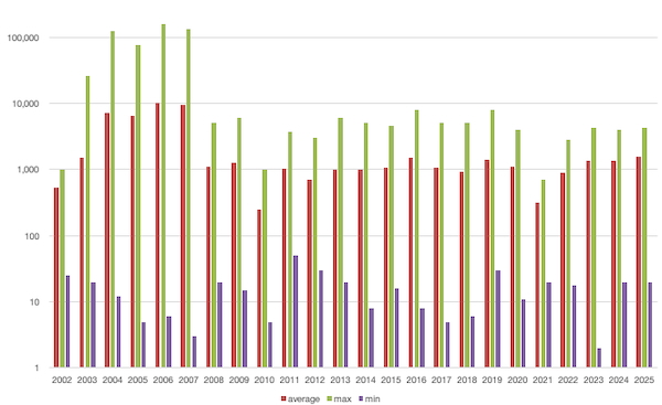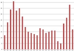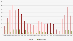 The number of shows per year has varied a lot: