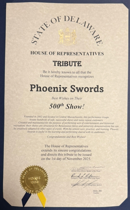 We were amazed that Jeff Spiegelman (http://www.jeffderepresentative.com ), the 11th district representative in Delaware, had heard we have performed 500 shows and presented us with a congratulation and best wishes statement from the state.